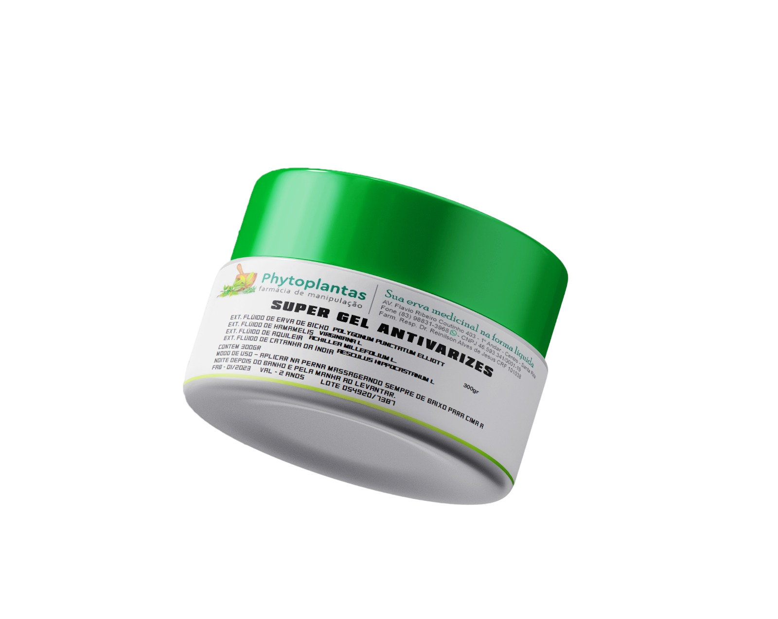O Super gel Antivarizes de ervas medicinais: é indicado especialmente para o tratamento de varizes, dores e má circulação. Foi desenvolvido com ativos naturais que agem diretamente na pele, aliviando dores, inflamaçoes circulatórias, ativação da circulação periférica, coceira (causada por úlceras varicosas e varizes), dores venosas, edemas devido à má circulação, flebites, insuficiência venosa crônica (inflamações gerais), peso e dor nas pernas, impurezas na pele, inchaço nas pernas e varizes. Além disso, possui ação emoliente, melhorando a hidratação da pele.